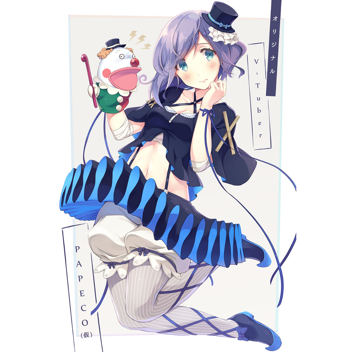 手にはめた人形に魂を宿らせる事の出来る気弱な少女【ぱぺこ(本名:綾吊ぱぺこ)】と、ドSでプロデューサー気質な人形【ぱぺを】のコンビ。「手品師」×「操り人形」×「ダンサー」の組み合わせを意識したデザインにしてみました。……操られているのは、どっち?